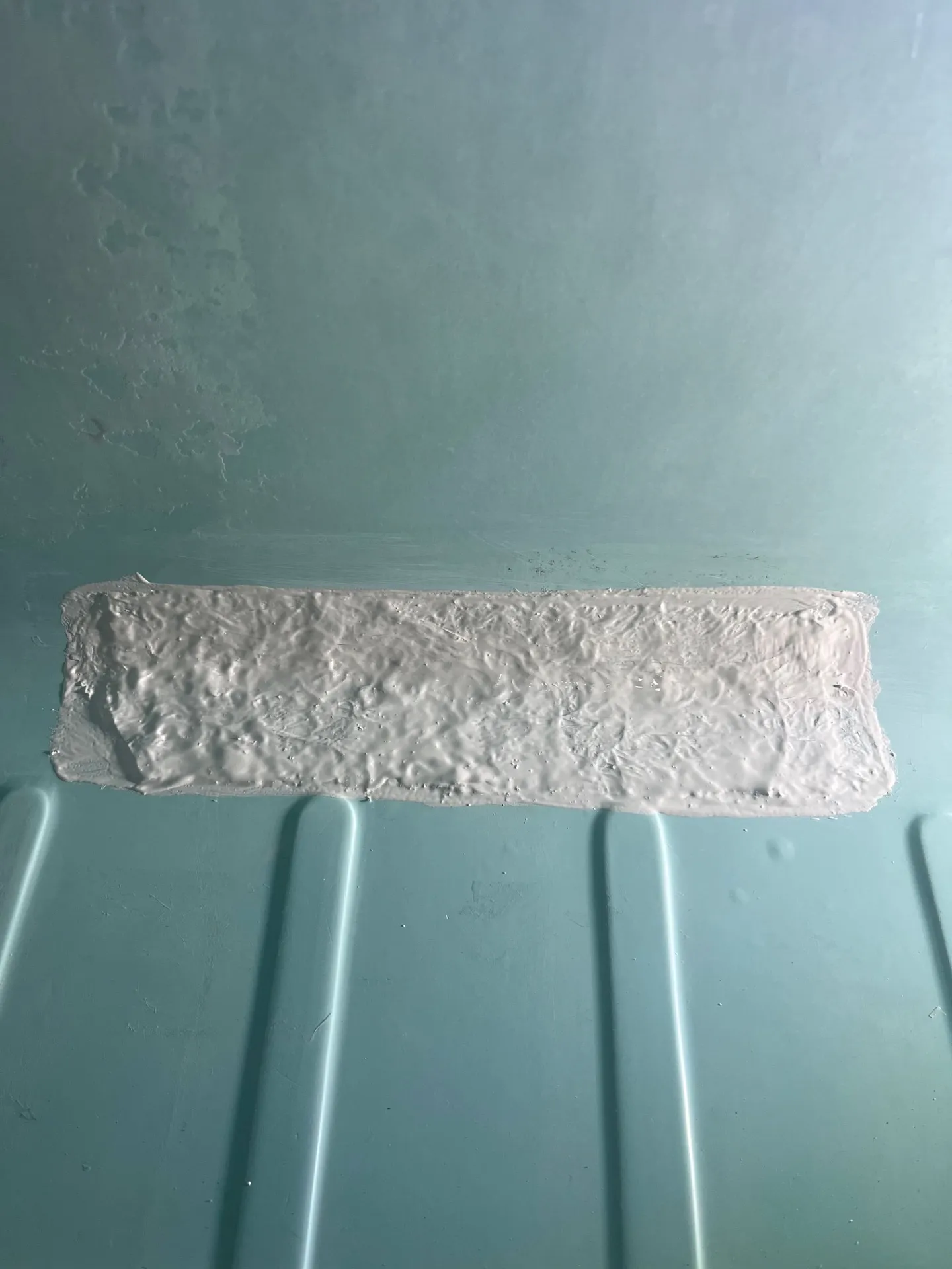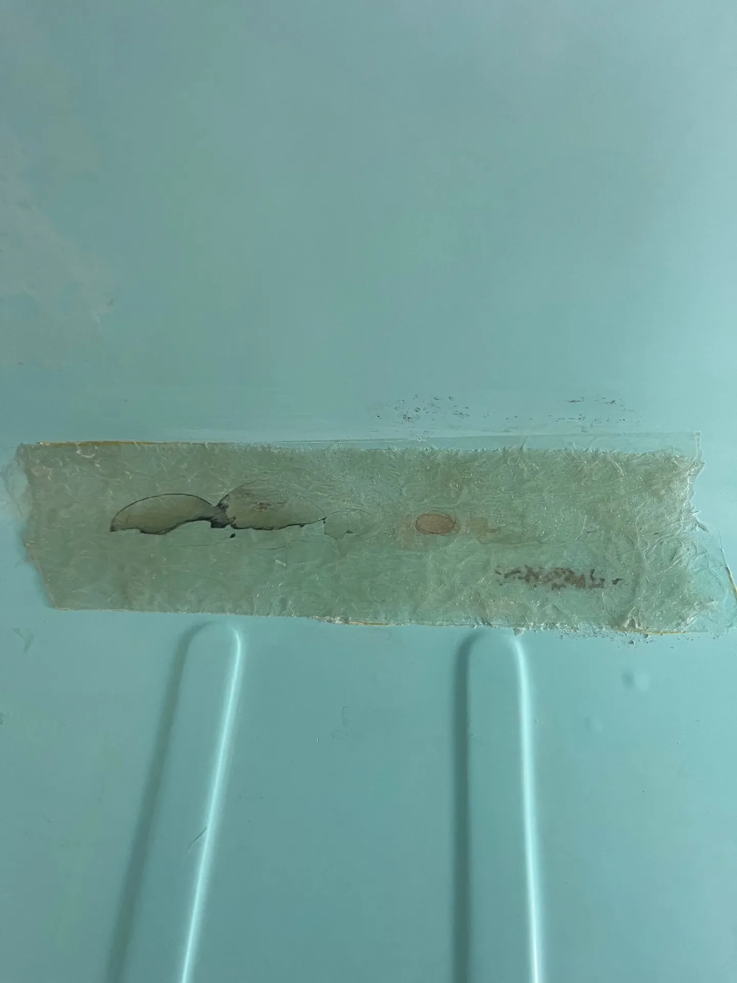 小田原市でユニットバスの穴補修(FRP防水)を行いました! 2026/04/29 ビフォー テキストテキストテキストテキスト 仕上げ前 ガラスマット施工(ガラスマットを敷いてFRP塗布) 仕上がり 研磨してトップコート